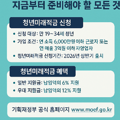 곧 공개될 청년미래적금 신청기간을 꼭 확인하고, 자신에게 맞는 청년미래적금 혜택을 놓치지 마시기 바랍니다.