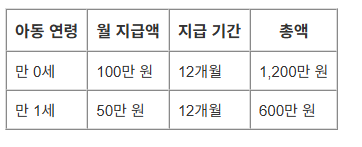 - 출생월부터 지급 시작 (출생일이 말일이어도 해당 월 전액 지급)