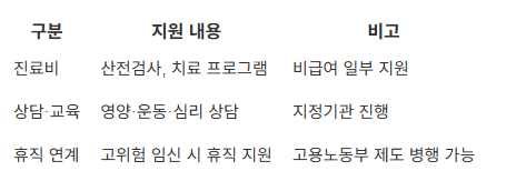 - 지원내용: 진료·검진비, 상담·교육, 고위험 임신 예방 관리, 휴직 연계