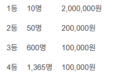 - 1등부터 4등까지 총 2,025명 당첨, 중복 당첨 불가합니다.
